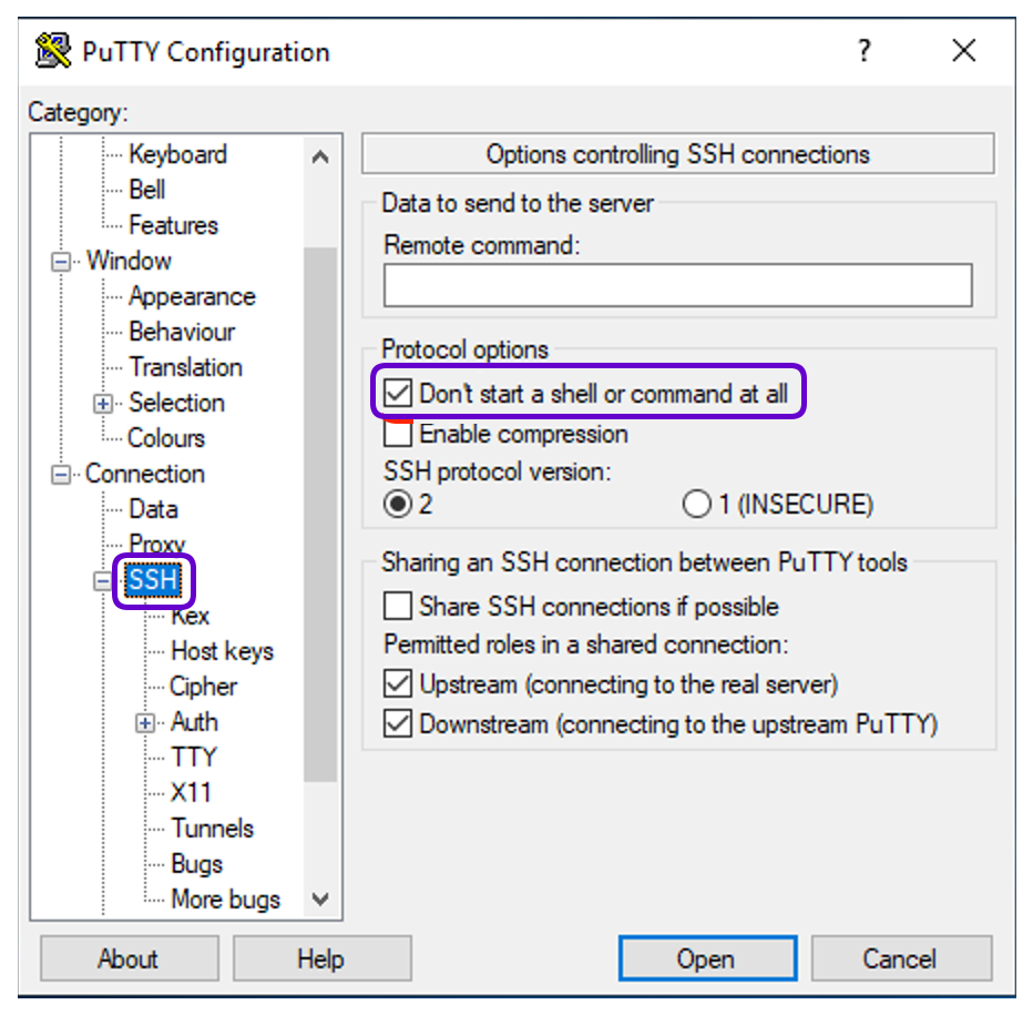 Go to the SSH tab and check Don’t start a shell or command at all.