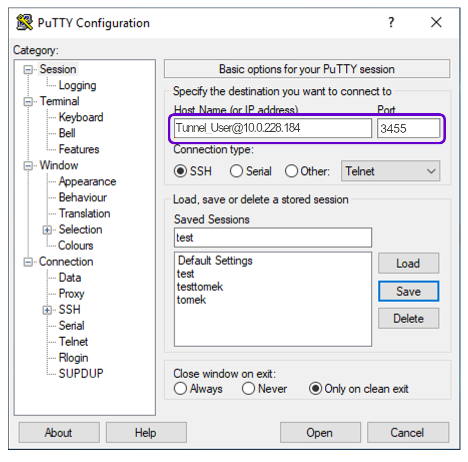 <Fudo_user>@<Fudo_IP_address>, e.g.,Tunnel_User@10.0.228.184.In the Port field, enter the port of the Tunnel-type listener created earlier (e.g.,
