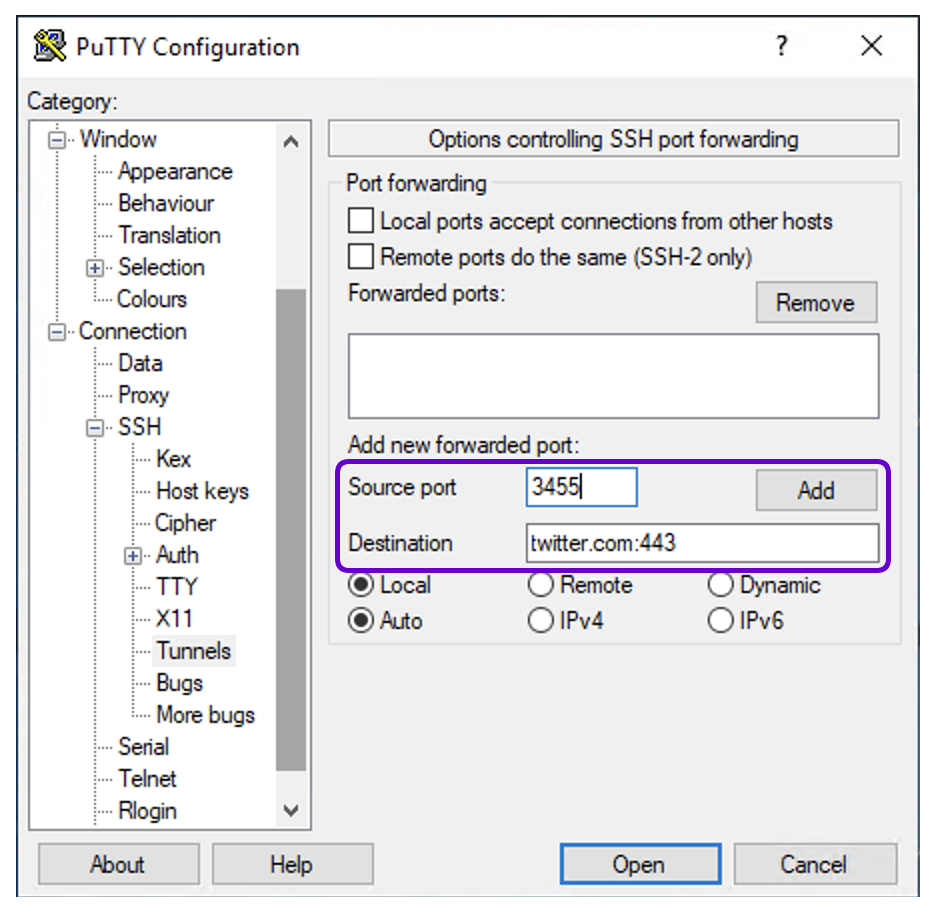 Go to the Tunnels tab and add a forwarded port: