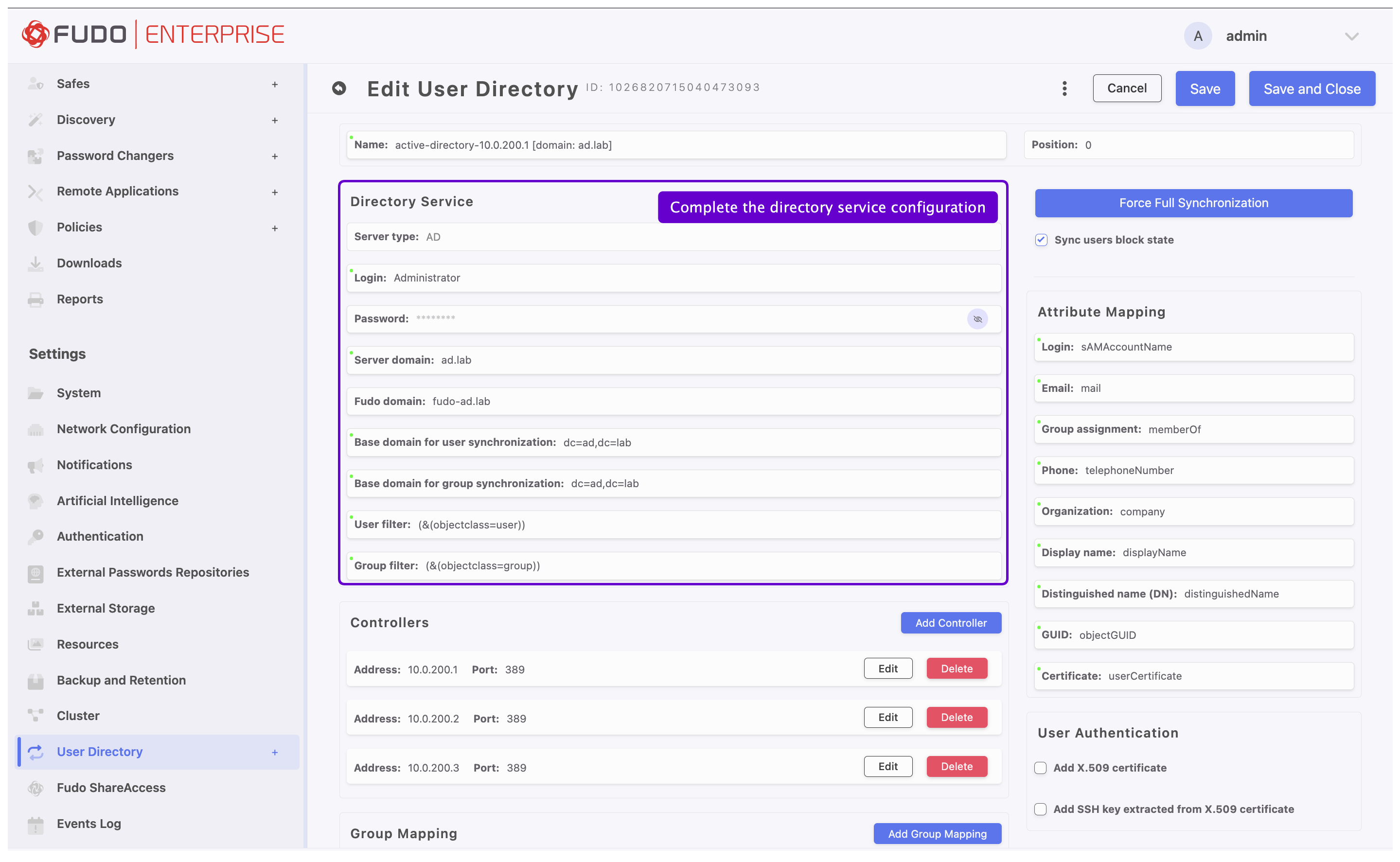 New users definitions and changes in existing objects are imported from the directory service periodically every 5 minutes. Deleting a user object from an AD or an LDAP server requires performing the full synchronization to reflect those changes on Fudo Enterprise. The full synchronization process is triggered automatically once a day at 00:00, or can be triggered manually.