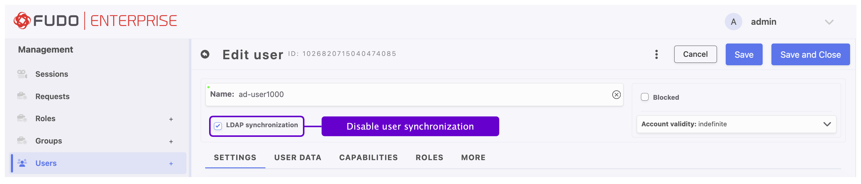 Fudo Enterprise allows synchronizing the user’s data with the LDAP service source. The Synchronize with LDAP option is responsible for this process. When this option is checked for the given user, an administrator can’t edit the user’s data manually but can add or edit their authentication methods. If the Synchronize with LDAP option is unchecked, the user is no longer synchronized with LDAP source, and can be edited by an administrator. The administrator can still check the option and reinstate synchronization with LDAP, but any change made manually will disappear with the next synchronization attempt. Only the added authentication methods won’t change.