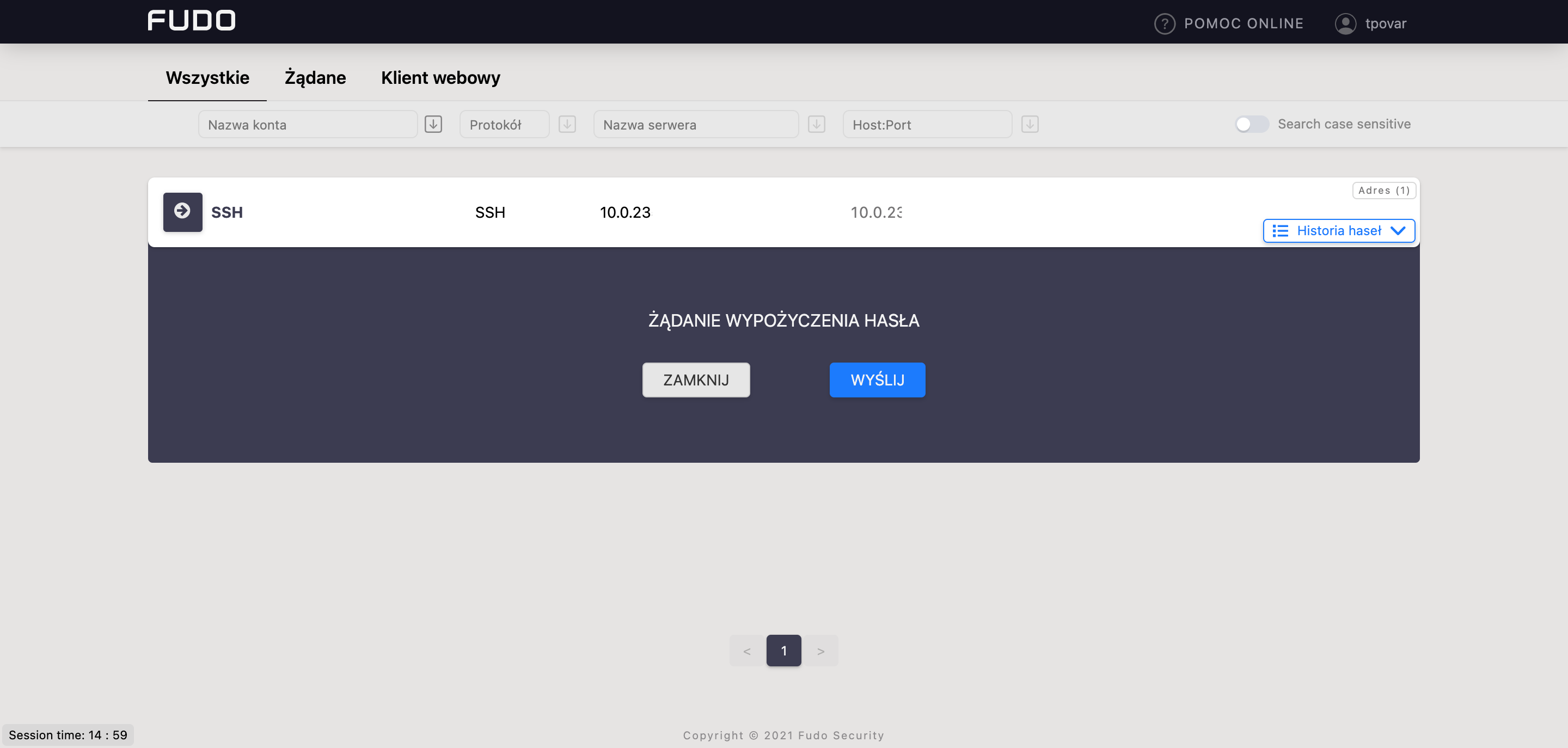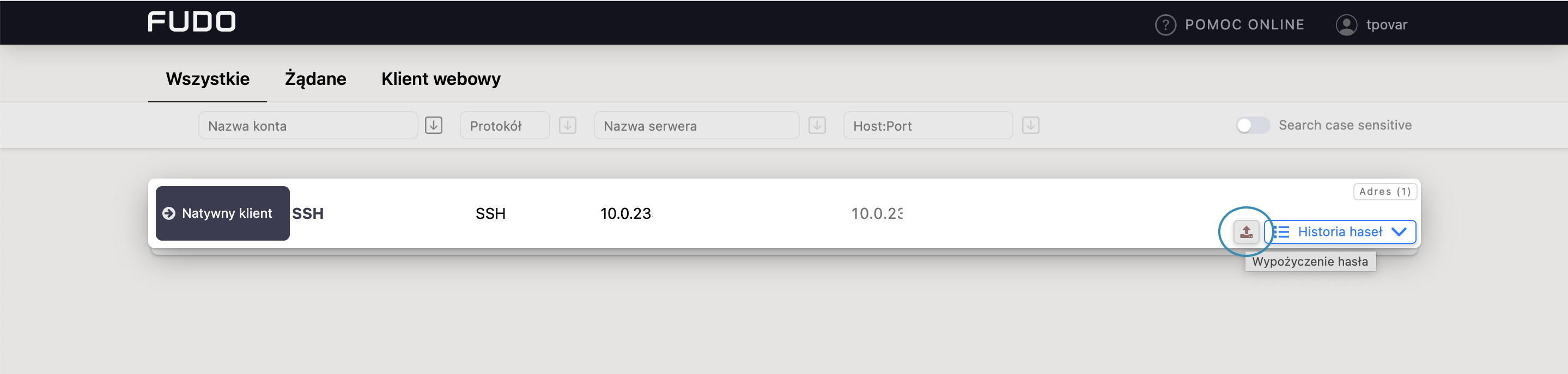 Przez Portal Użytkownika można czasowo wypożyczyć hasło dostępu innego konta. Jeśli dla danego użytkownika administrator ustawił określony okres dostępu do hasła, to jego „zwrot” odbędzie się automatycznie po upływie zdefiniowanego czasu. W przeciwnym wypadku, użytkownik jest zobowiązany „zwrócić” hasło manualnie.
