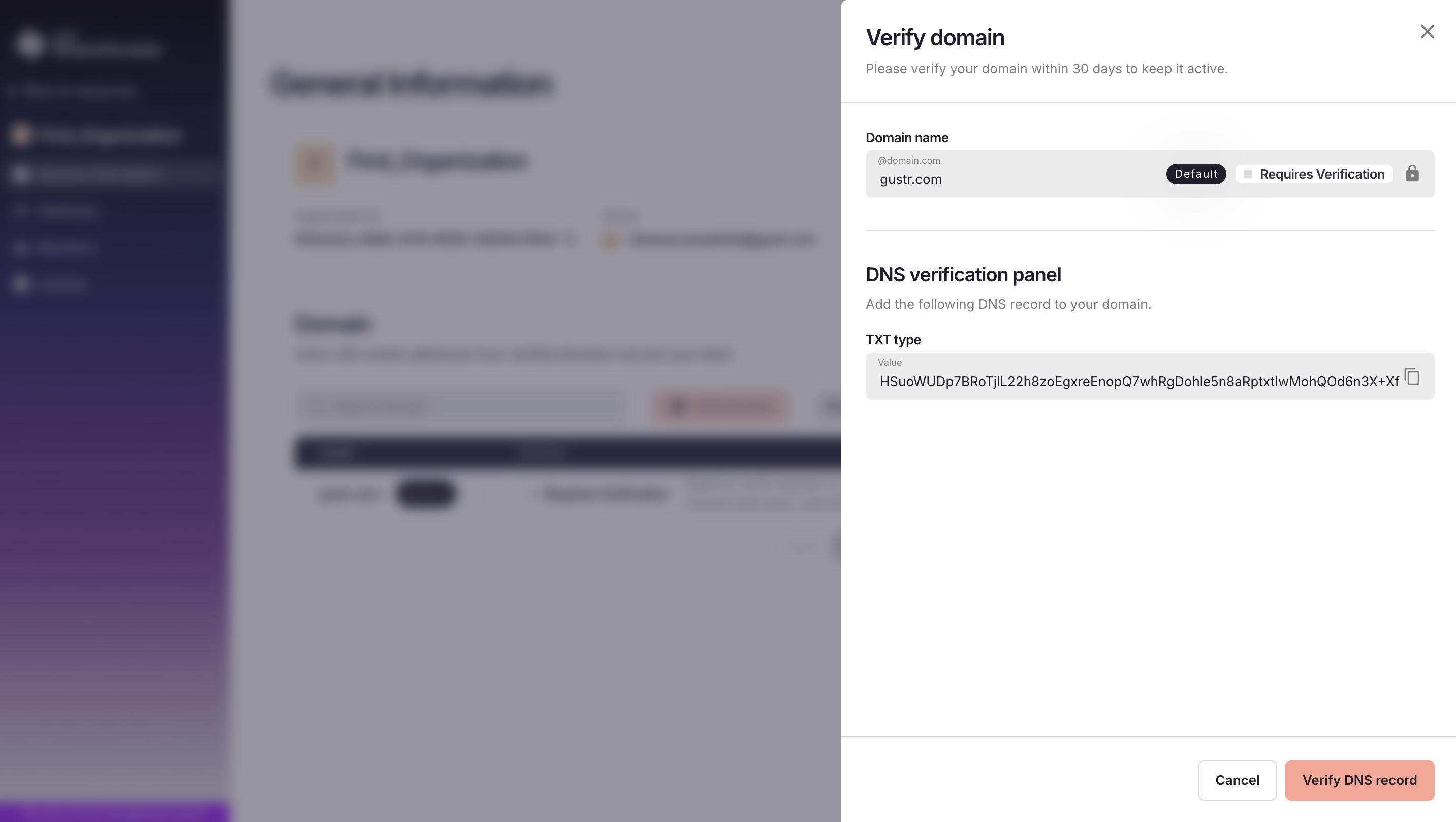 Domain verification consists of adding a specified DNS record, which serves as proof of control over the domain configuration. Only after this process is successfully completed can the domain be used in the system, in particular for automatically assigning users to an organization. This mechanism ensures that organization management and the associated email domains are handled exclusively by entities that have actual control over the company’s email infrastructure.