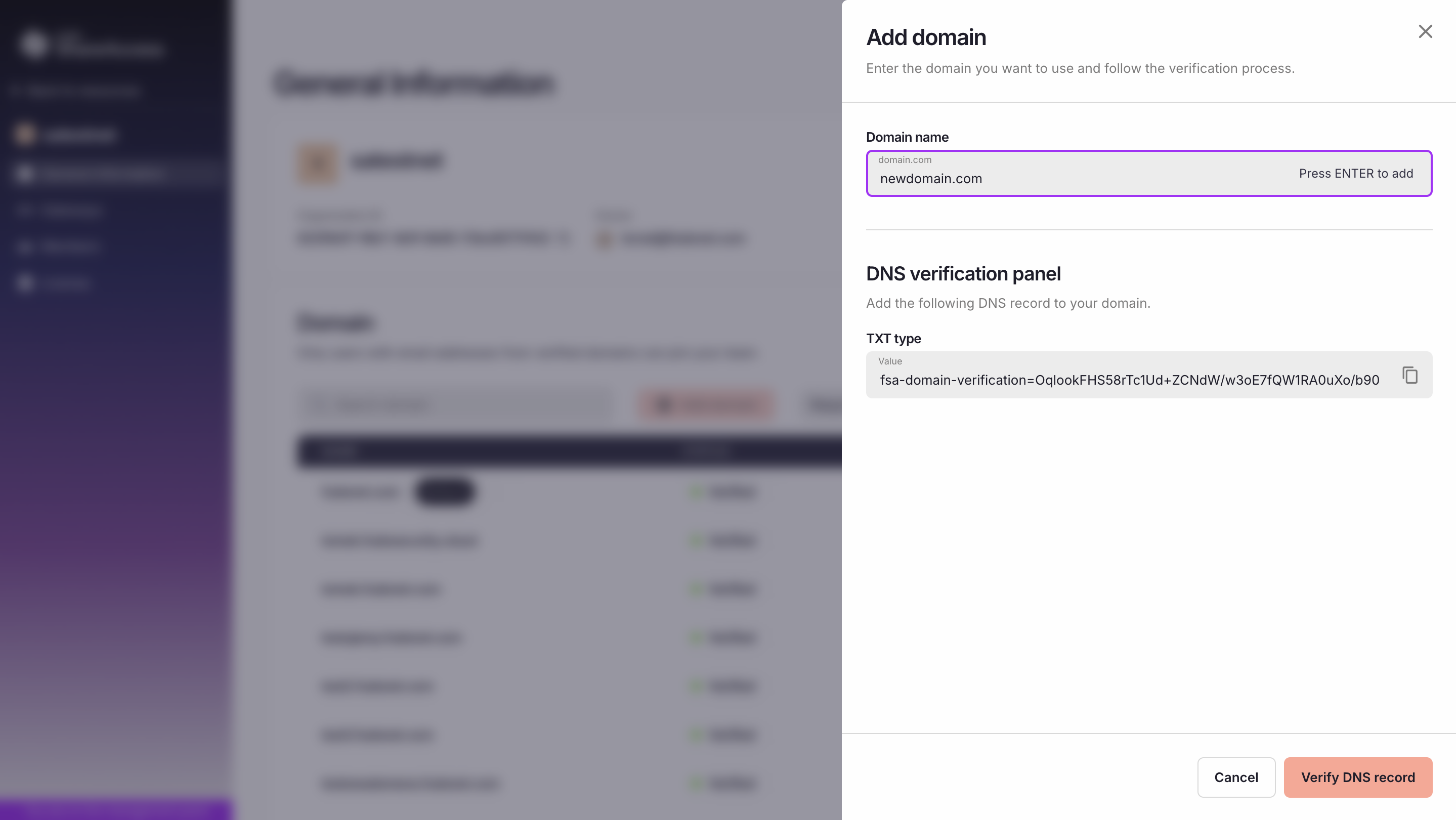 A TXT value required for domain verification will be generated in the dialog window, and the domain will be added to the list with the status Pending verification.