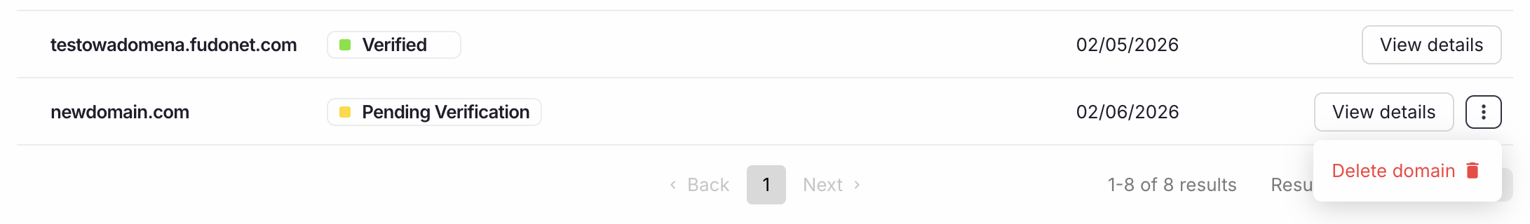 Open the context menu by clicking the three-dot icon and select Remove domain.