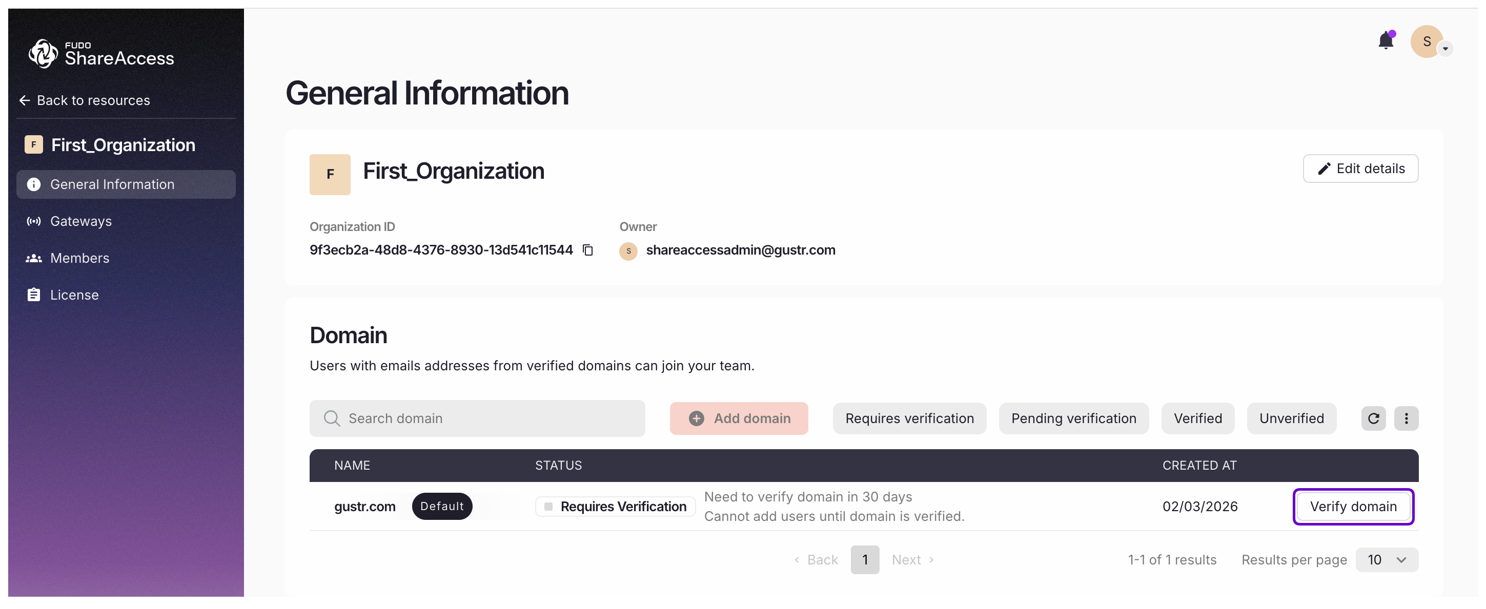 - Only after successful verification can the domain be used for automatically assigning users to an organization.